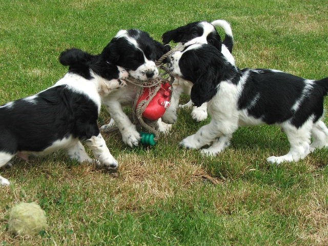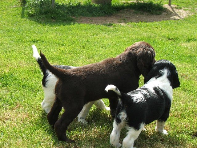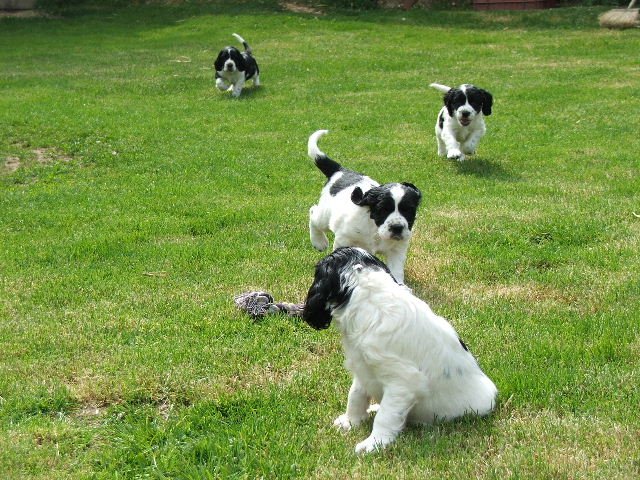 Špringřím štěňátkům je šest týdnů. Začínají zkoumat venkovní výběh. Je to roztomilá banda.