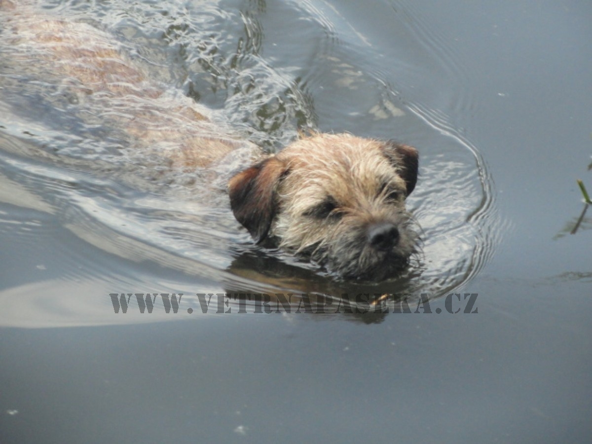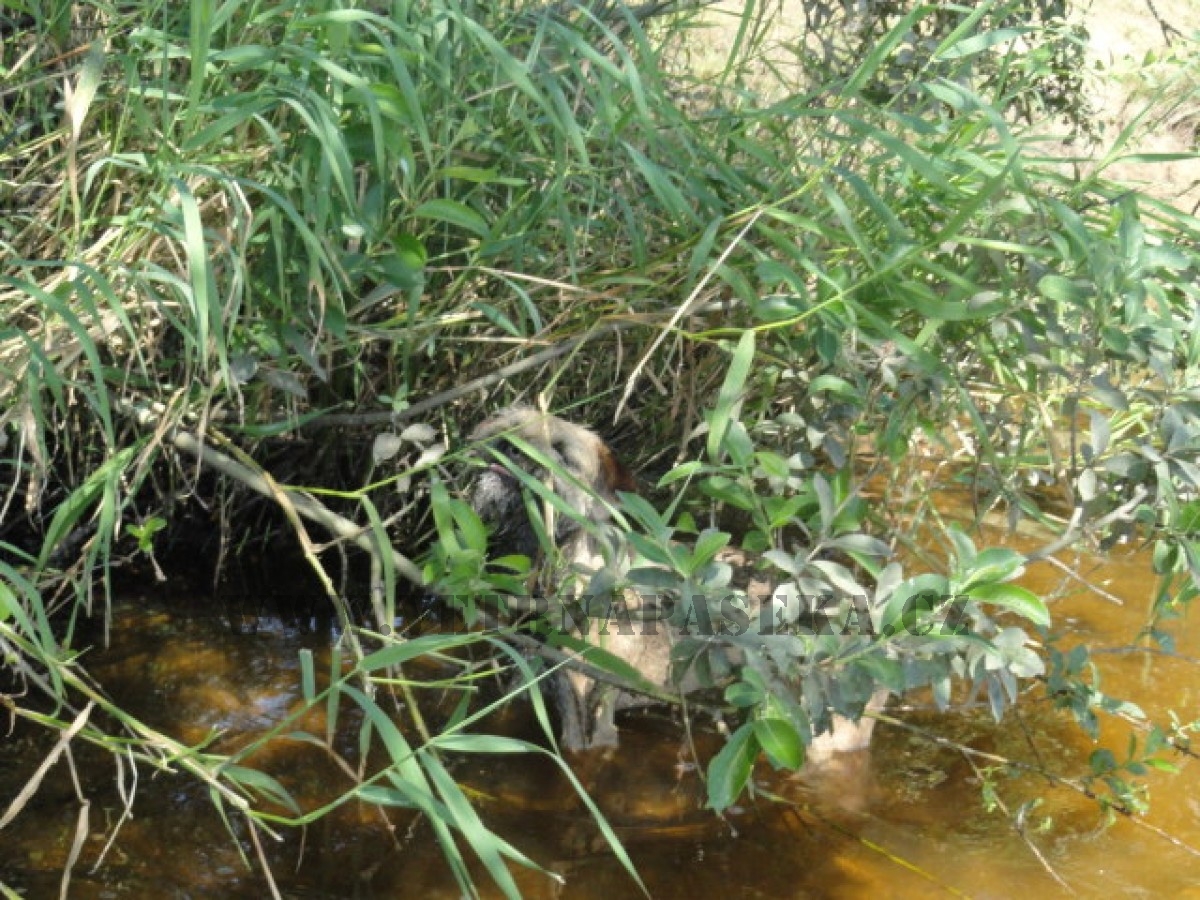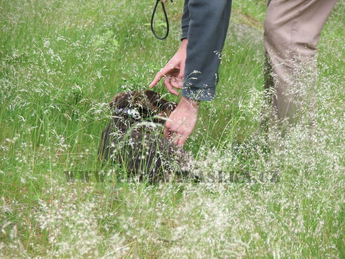 6.7. se výcvikový den konal o rybníka, kde jsme procvičovali disciplíny na speciální zkoušky z vodní práce. Border teriérka "Kik" a její vůdkyně byly moc šikovné, akorát chudinka měla co dělat, aby vytáhla kachnu z hlubokého rákosu plného bahna. Dále se procvičoval Hubert z Větrné paseky a vůdce od křepelice Tíny, která nemohla trénovat kvůli hárání. Páníček se alespoň koukal a učil se. Opět Giulian asistoval.