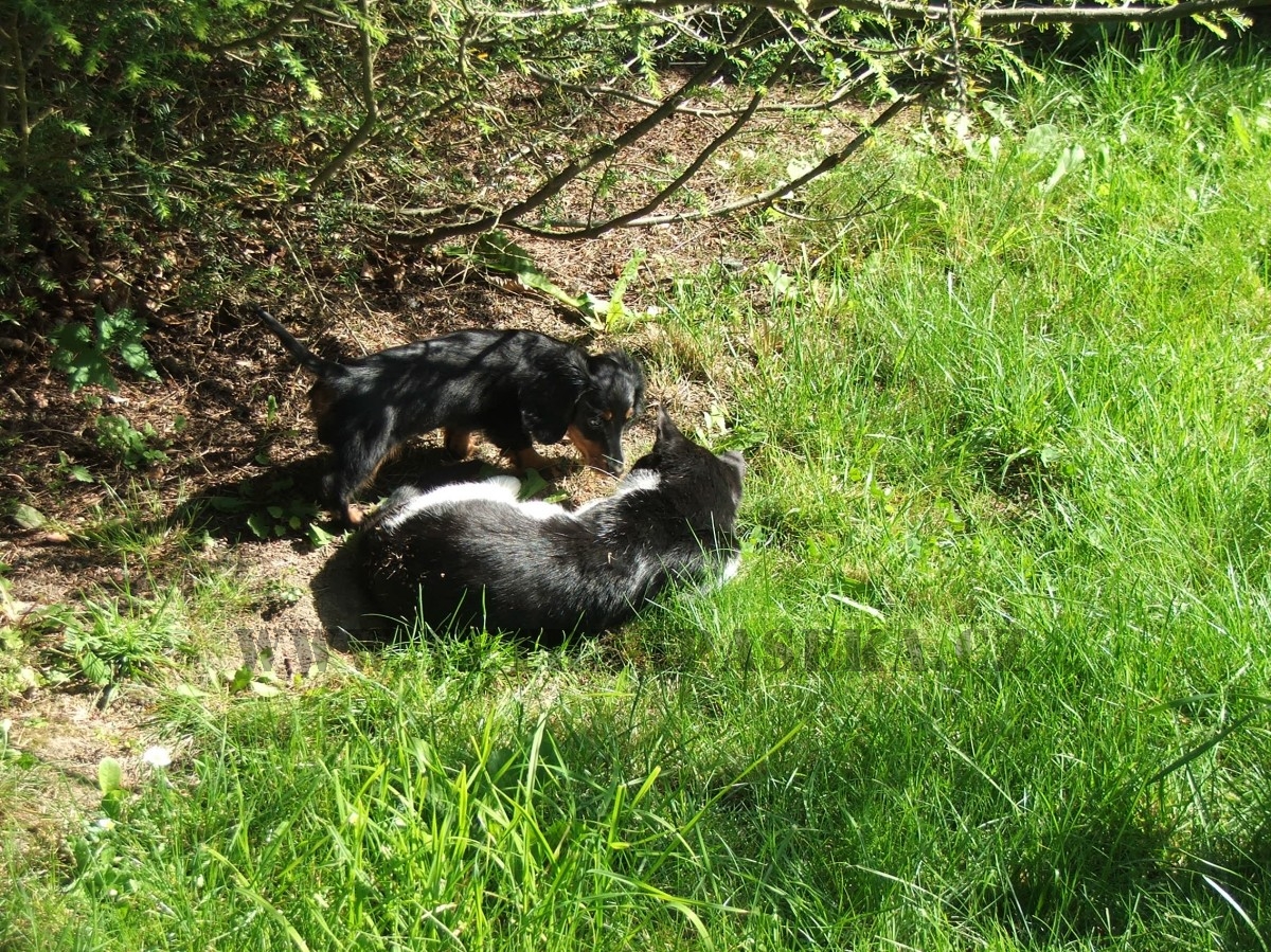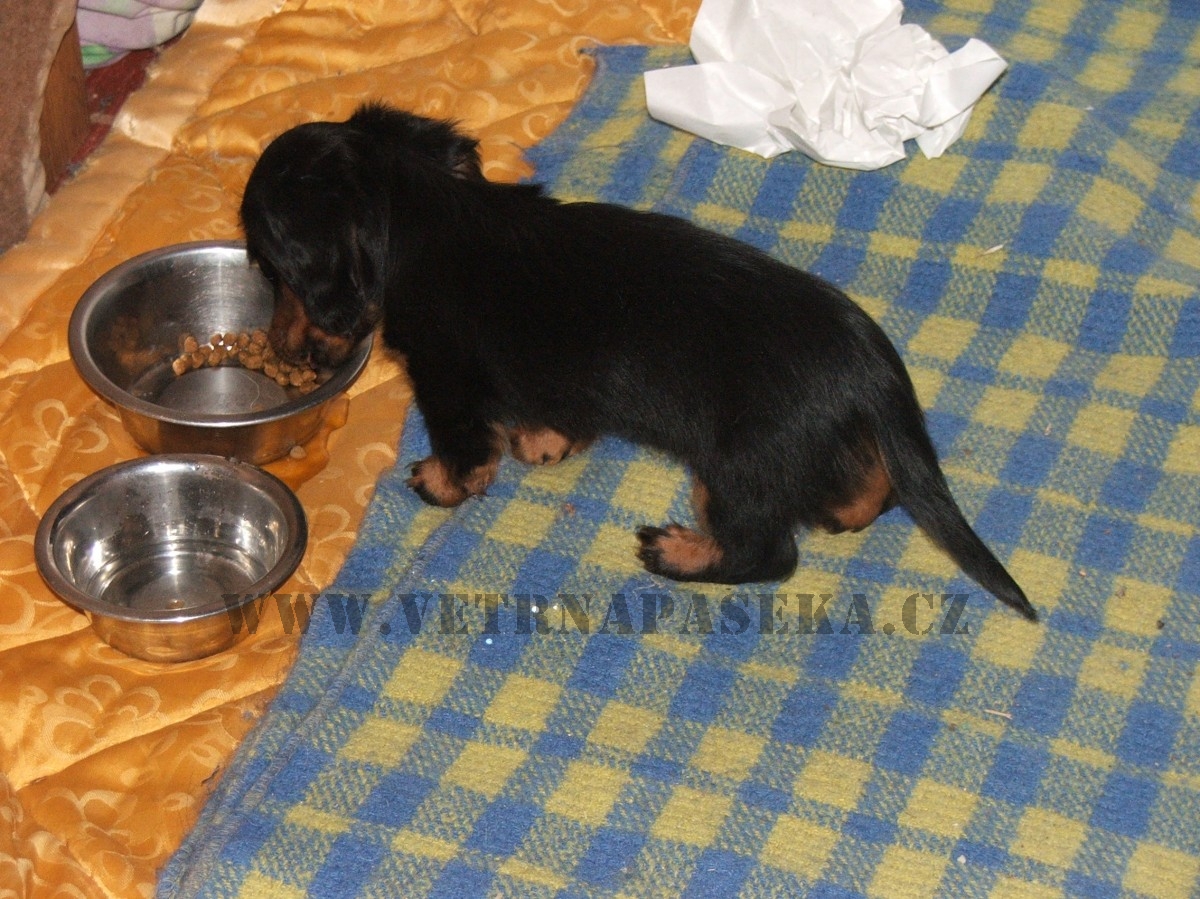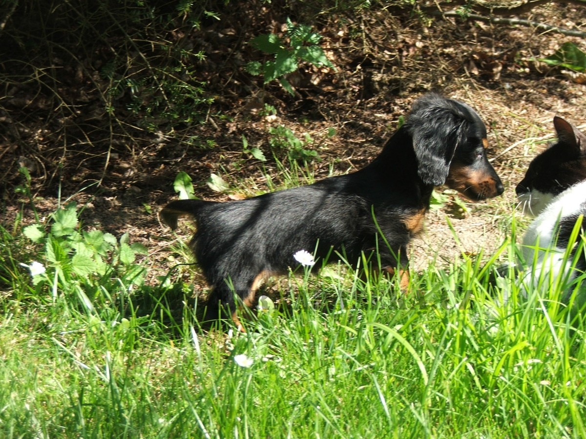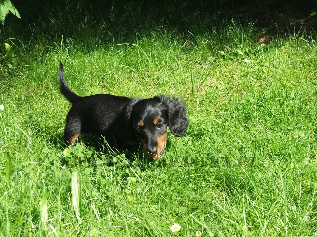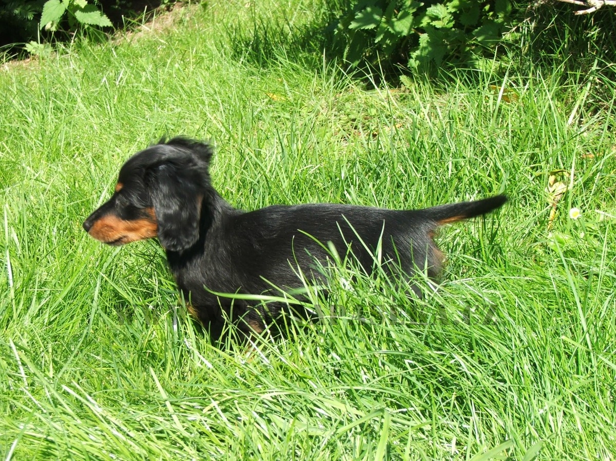Naše smečka se v srpnu rozrostla o neplánovaný přírůstek jezevčíka trpasličího/králičího dlouhosrstého. Tento dáreček jsem nečekala (mám už dost velkou smečku).Je to černá fenečka s pálením a teď už jsou jí necelé čtyři měsíce. Je to velká uličnice, čipera, vysoce temperamentní a je chytrá jako opice. Pochází z chovatelské stanice GOLD MADEIRA, kde jsou tito malí čiperové vedeni jako lovečtí pomocníci a jsou zároveň exteriérově na vysoké úrovni.