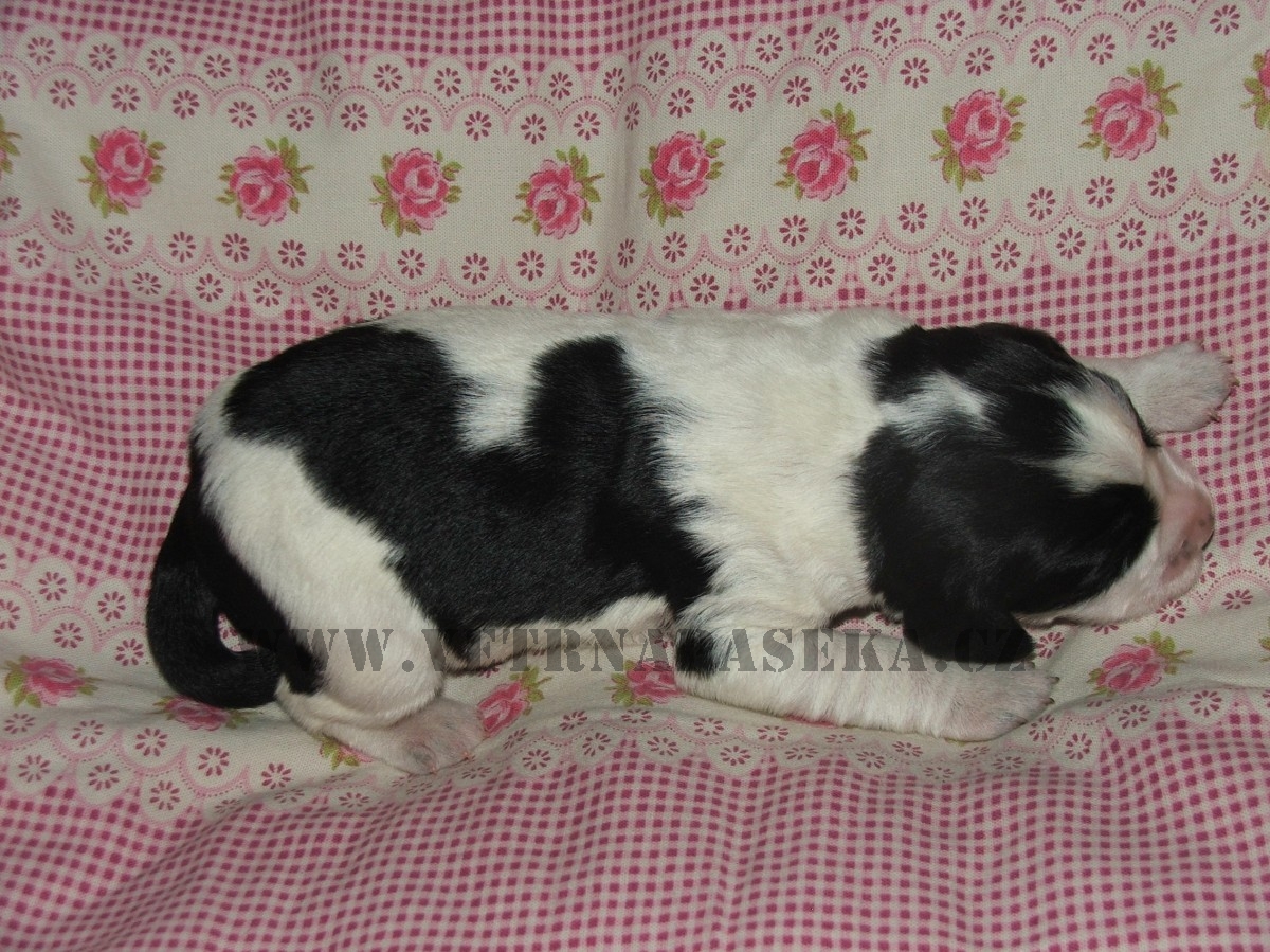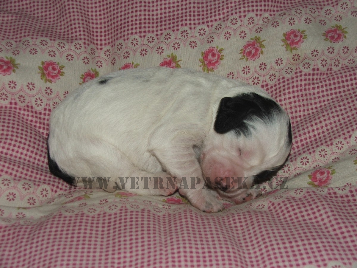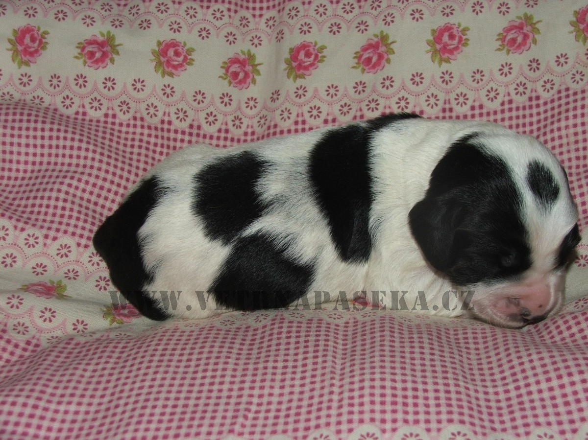 Fenka č. 1 - hnědobílá (Hnědulka) Fenka č. 1 - hnědobílá Fenka č. 2 - černobílá Fenka č. 2 - černobílá "Bělinka" Fenka č. 3 - černobílá Fenka č. 3 - černobílá "Kolečko" fenka č. 4 - černobílá "Straka" Štěňátka - foto šestý den Dej už pokoj s tím focením, musím kojit!