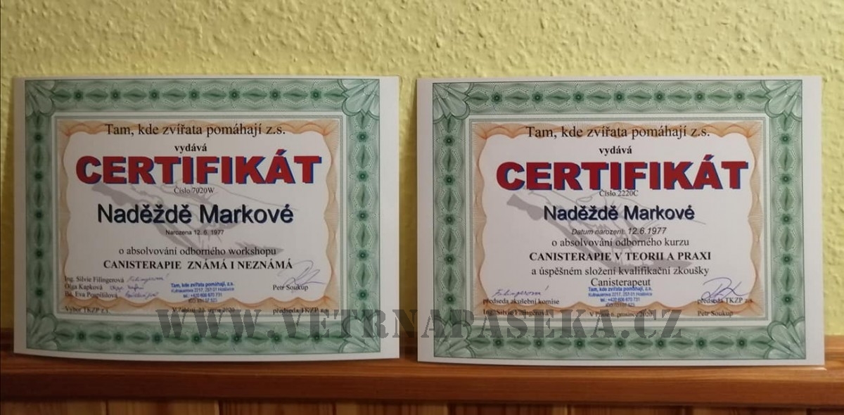 Můj velký sen bylo stát se canisterapeutem a složit s Nerem z Větrné paseky canisterapeutické zkoušky. Vybrala jsem si spolek - TAM, KDE ZVÍŘATA POMÁHAJÍ a tím to vše začalo. Nejdříve jsem u tohoto spolku absolvovala víkendový seminář VÝCHOVA A POSLUŠNOST PSA. Nero se po tomto semináři jevil, že by mohl canisterapeutickou zkoušku udělat. Já jsem se chtěla ještě více o canisterapii dozvědět a tak jsem ještě absolvovala týdenní WORKSHOP v srpnu, opět pod vedením uvedeného spolku. Teď jsme již byli oba na zkoušky připraveni a nic nebránilo tomu se na kurz canisterapie přihlásit. A jak to celé dopadlo? Oba jsme zkoušku úspěšně složili. Teď nás oba čeká tuto krásnou práci vykonávat co nejzodpovědněji, jak to jen půjde. Canisterapii budu vykonávat v Integrovaném centru pro osoby se zdravotním postižením. Tím chci poděkovat všem, kteří mě podpořili, zejména rodině a zaměstnavateli.