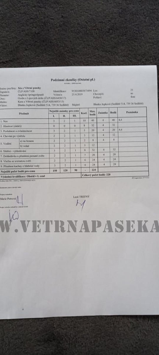 Xanta z Větrné paseky - 1.8. KVP II.cena 710 b., PZ III.cena, OMS Tábor, BZ III.c. Ždár n. S., KZV Brno, I. cena, CACT 192 b., 16.10. KPZ I.cena CACT, KBZ - 24.10. I. cena CACT, VZ III.c. 440 b. (bohužel kachna za 1) , hlas. 4