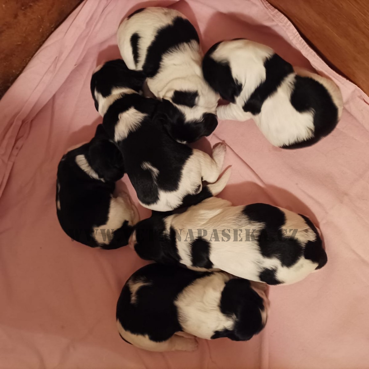 Werra porodila 15.3. šest krásných černobílých štěňátek. Dva pejsci a čtyři fenečky, z toho jedna s pálením, jsou v pořádku a maminka také. Štěňátka jsou zadaná!